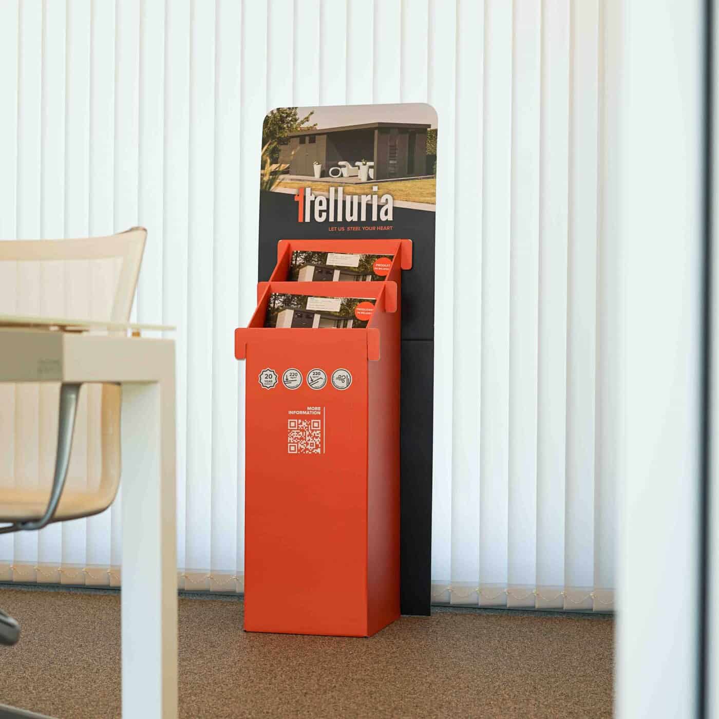 Met een grote kartonnen brochuredisplay vergroot Telluria haar zichtbaarheid én zorgt het bedrijf ervoor dat bezoekers vlot de brochures kunnen meenemen, zelfs als er weinig tijd is om te praten.