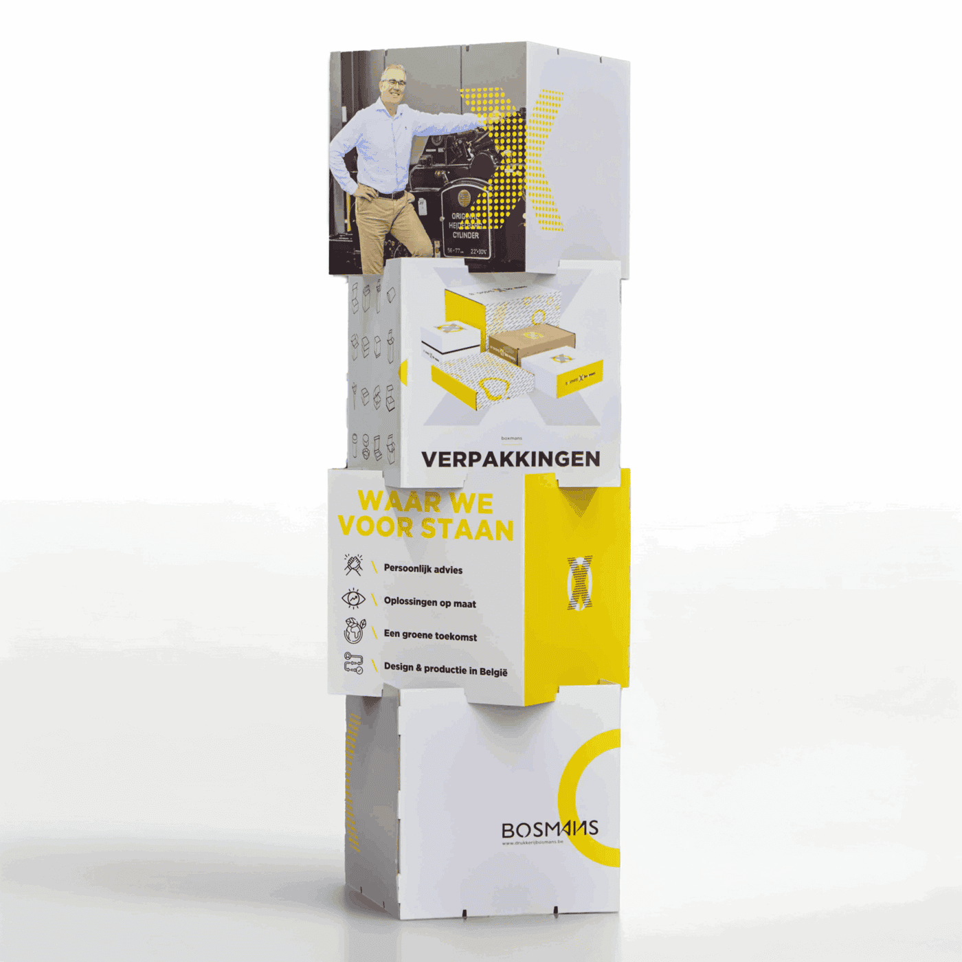 Zo kiest bijvoorbeeld Saunaco voor een modulaire instadisplay. Deze levensgrote totem bestaat uit enkele losse panelen die vlot in elkaar schuiven. Snel op te bouwen én ultra compact om te vervoeren.